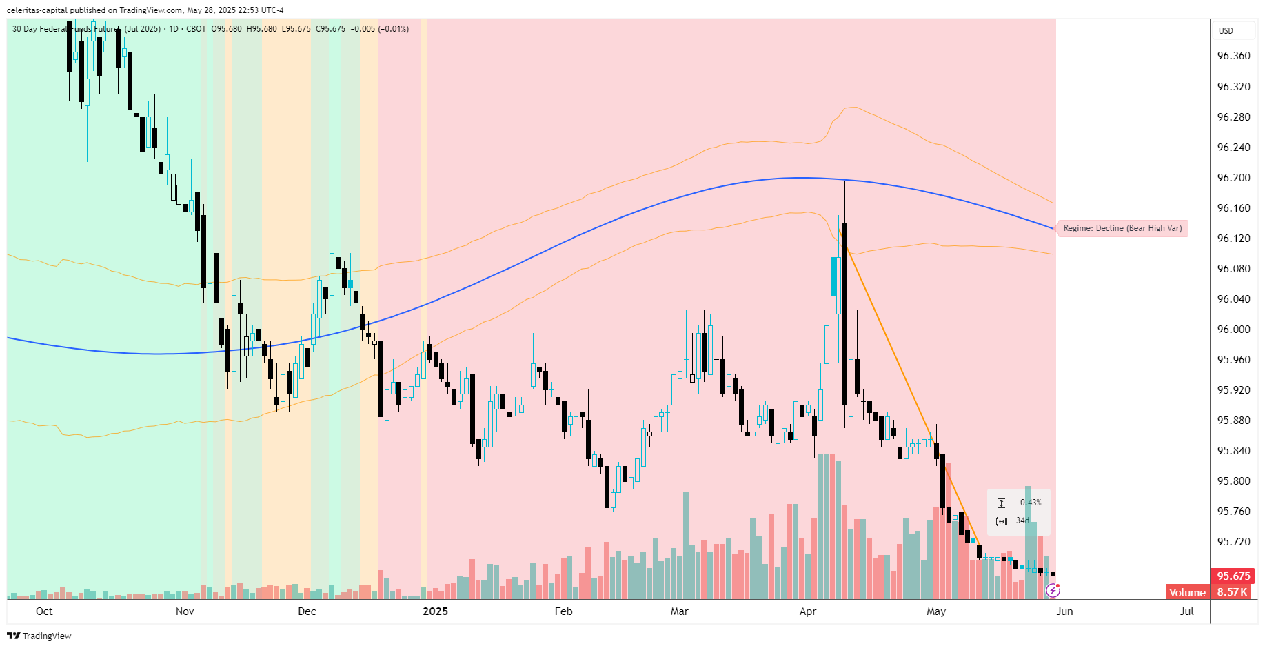 Following Liberation Day, the market began aggressively pricing in significant rate cuts in the July 2025 Fed Funds contract (ZQN2025). At the peak, the contract was implying three cuts—or 72 basis points—in just three meetings. In my view, this was highly improbable. I didn’t believe the tariff situation alone would be enough to force the Fed’s hand so quickly.
