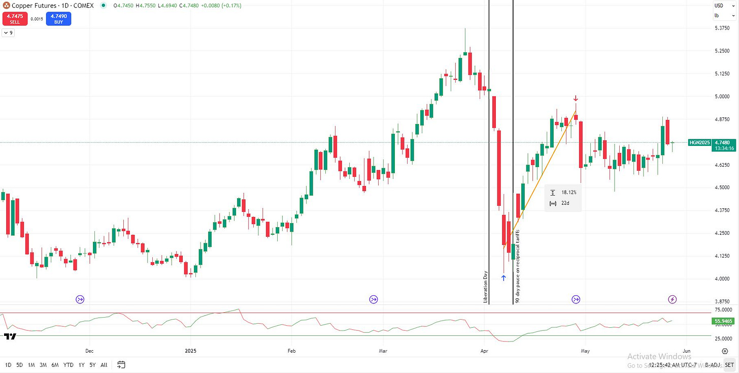 So, on April 7th, I went long copper via futures contracts, entering at 4.1660 with a position size of one contract. Just two days later, on April 9th, the administration announced a 90-day pause on any additional tariffs beyond the base 10% rate.