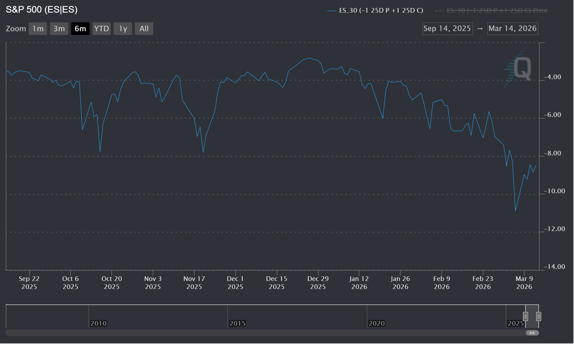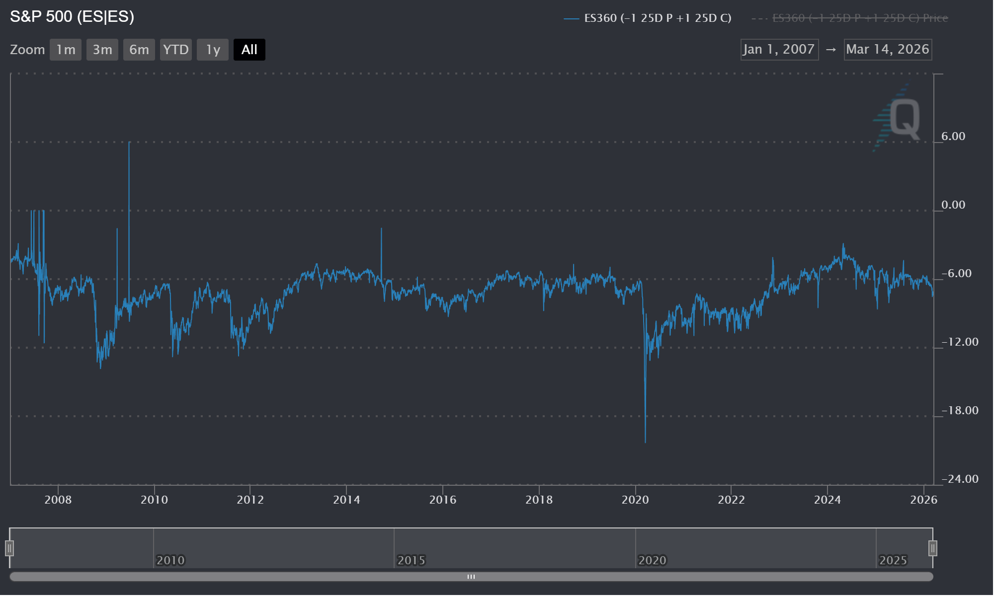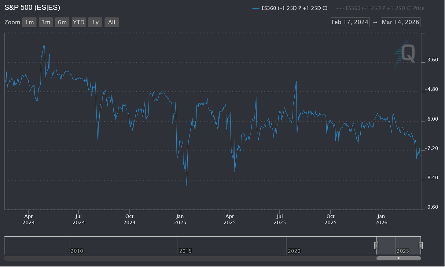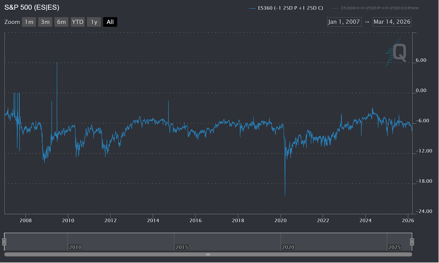ESH6 and ESM6 25 Delta Risk Reversals (25D RR) continue pricing a greater probability of a crash down than a violent move up. The constant maturity ES Z-Scores for 25D RR vol skew shows that the longer the tenor the higher the vol on the put side of the RR. I believe this fairly normal as indexes are often used to hedge downside risk for a book long equities. Also history shows paying for insurance on a large equity book via puts on the SPX or ES has been a solid hedge. However, the constant maturity for 360 days for ES shows the put skew spiking driving the chart lower. (Figure 8) While this is certainly a sharp drawdown in comparison to the last year it is nothing compared to history. (Figure 9) It is my view that put skew will start to cool meaning OTM call vol rises faster than OTM put vol. At least on longer tenor options. Shorter term for example, the constant maturity for 30 days for ES options had a reading of -8.47 far below the lower quartile of -5.99 and mean of -5.18. (Figure 10) The LQ and mean I quoted are for the entire data set I have which goes back daily to early 2007. (Figure 10)