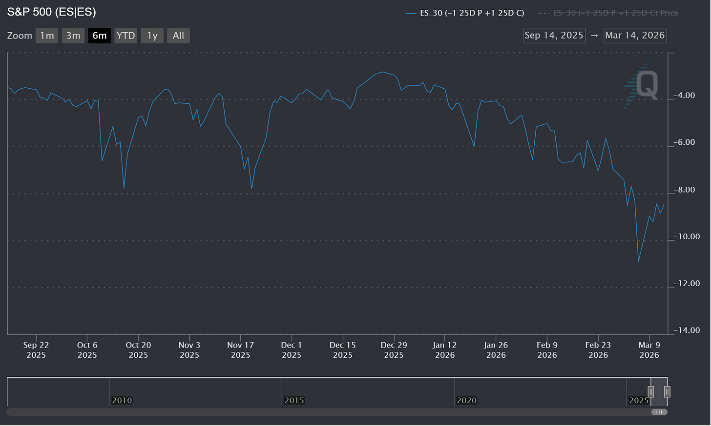 To make a very long story short watch shorter dated put vol (30 days and less) and 25D call vol. In my view the market is mispricing upside risk ASSUMING this war Iran doesn’t expand to a full invasion. If there is a full invasion than downside protection is still relatively cheap.