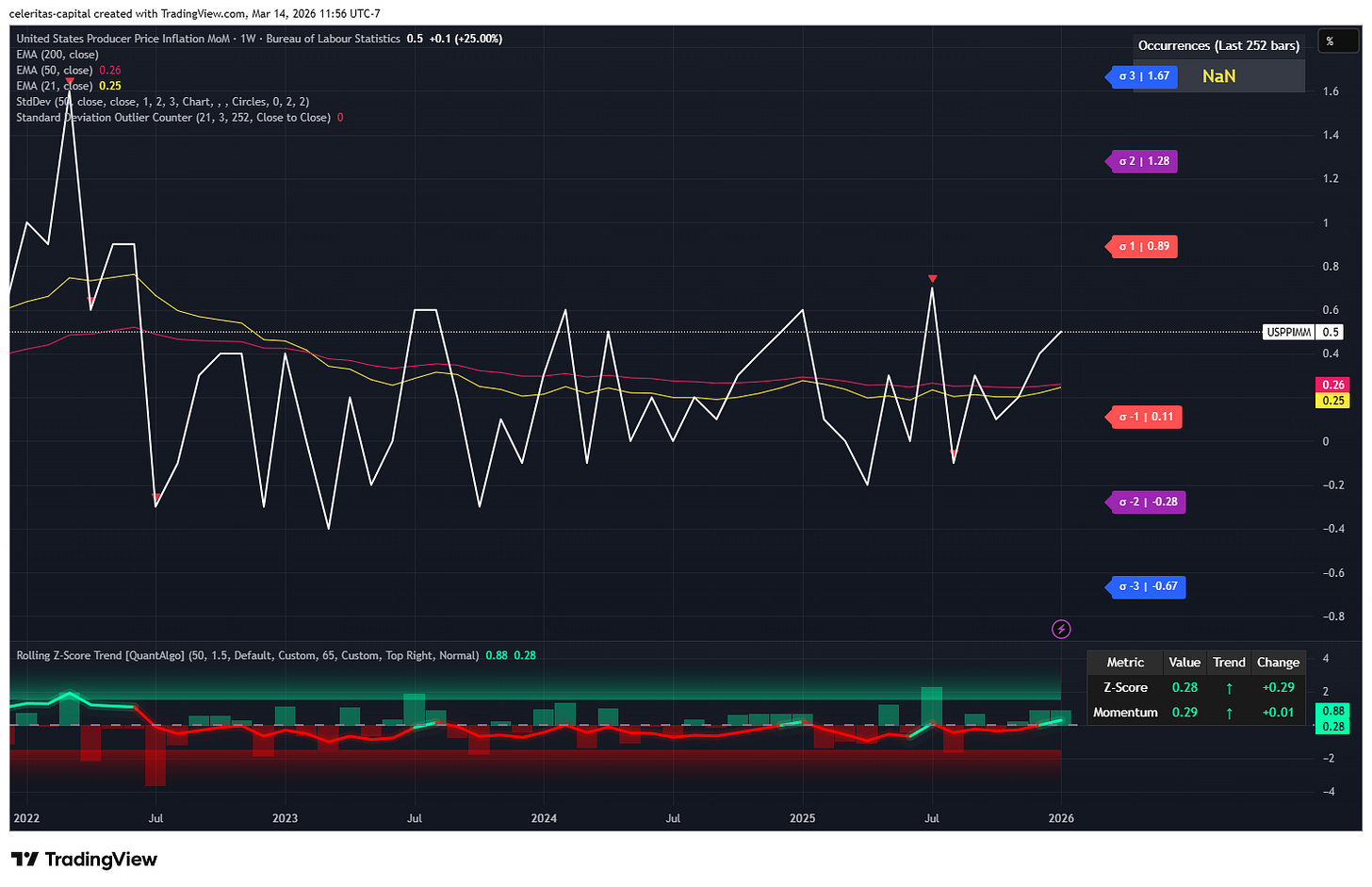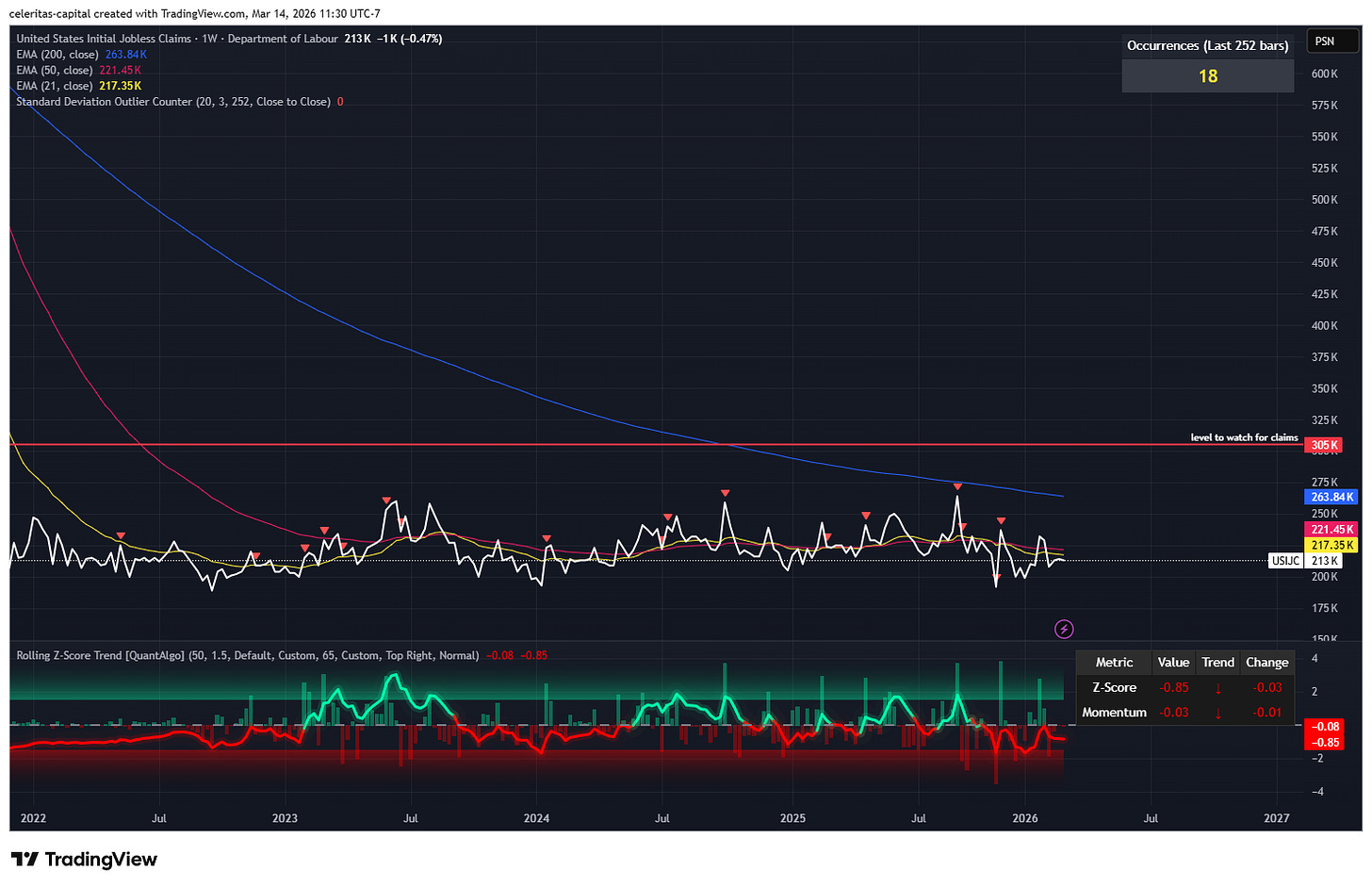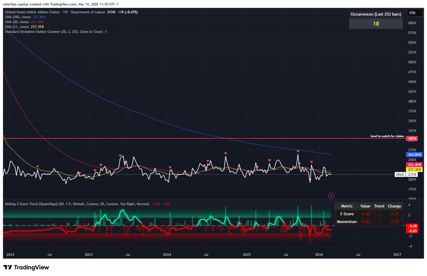 This week is sure to be an interesting one with a FED meeting. Which is likely to be a nothing burger overall but if you watch rates I think important sentiment from FED members might be gained via disneters, etc. Then on Thursday we have Initial Jobless Claims. I expect that we stay under the the scary red line of 305k which is still quite a ways out more proof the US labor market is not all doom and gloom. (Figure 1) In fact I think we print below one standard deviation upwards about 221 k jobless claims is my calculation. I forgot to mention that Wednesday morning 3/18, we get PPI in the morning before the FED meeting.