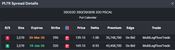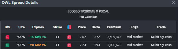 Finally lets end with what assets I will be watching this week. Of course the classics are on the menu like ES, NKD, whole SOFR curve as well as bond futures. Two equity names I will be watching PLTR 0.00%↑ & OWL 0.00%↑ both of which have been in the news recently but my eye was caught by something else. Using QuikOptions (following the link should let sign up for a free account that offers a ton of stuff. The monthly or yearly subscription is even more powerful and how I can view and analyze these spreads). The PLTR 0.00%↑ trade that caught my eye was this put calendar spread. This was a Floor Trade, if you want my opinion it is likely a vol trade. (Figure 14) It could be long the longer dated tenor and short near term vol but of course I don’t know but I will be watching PLTR 0.00%↑ using QuikOptions.