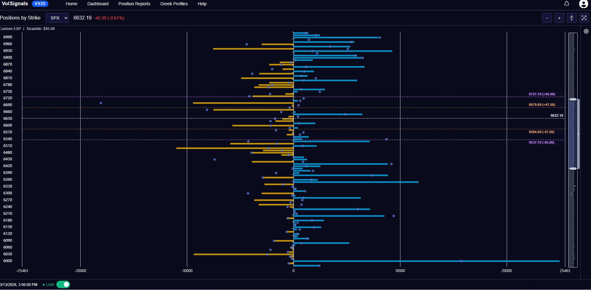 Now looking at the position by strike tool by VS3D you can see every 10 strikes along with MMs exposure at the strike. The blue bars are dealers being NET long options at that strike (don’t worry about calls or puts right now) for example the long blue bar at the bottom of Figure 7 is the 6000 strike in which dealers a long more 20,000 units there. The yellow bar is when dealers are NET short options at a strike. (Figure 7) If you have questions leave a comment and I will try to help and if I can’t I will try to point you in the right direction.